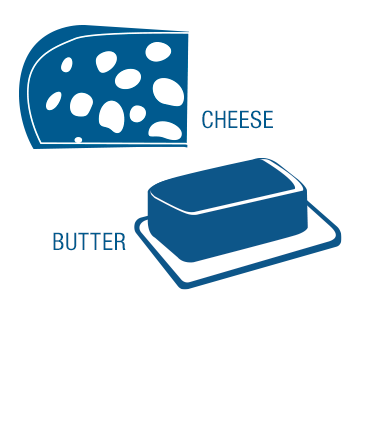Cheese is made directly from milk by coagulating or curdling milk, stirring and heating the curd, draining the whey and collecting or pressing the curd. We offer a variety of cheeses, such as: Cheddar, Mozzarella, Gouda, Edam, Swiss, Parmesan, Blue Cheese, Colby Jack, Cream Cheese, and Analogue Cheese.
